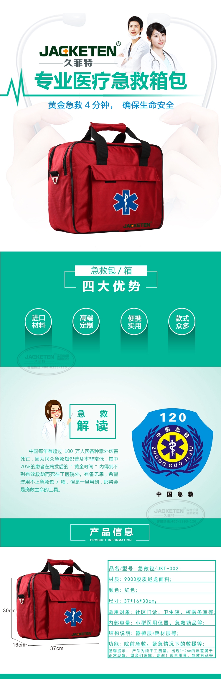品名/貨號:急救包/JKT-002;材質(zhì):900D股質(zhì)尼龍面料;顏色:紅色;尺寸:37*16*30cm;適用對象:社區(qū)門診、衛(wèi)生院、校醫(yī)務(wù)室等;內(nèi)部容量:小型醫(yī)用儀器、急救藥品等;結(jié)構(gòu)說明:器械層+耗材層;功能:院前急救、緊急情況下的救援等